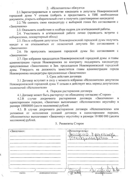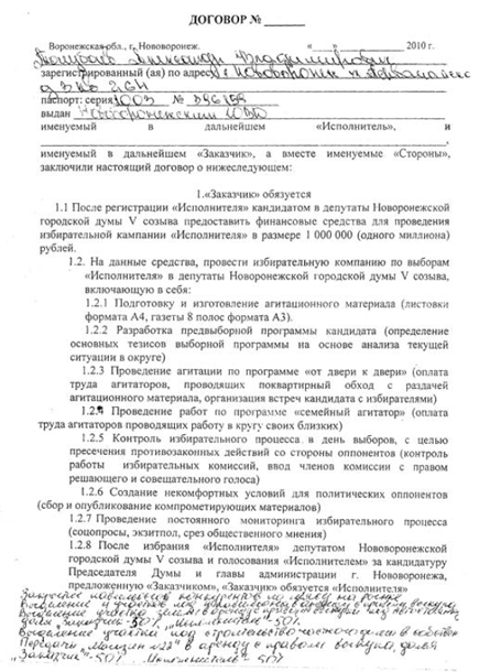 Последние на форуме:Как Путин боролся с коррупцией11 ноя’23, 13:38 Как Путин боролся с тарифами ЖКХ 11 ноя’23, 13:36 Корпорация «Россия». Путин с друзьями поделили страну 14 мар’21, 00:27 95% российской промышленности принадлежит иностранным оффшорам 14 мар’21, 00:12 Путин и благотворительность для больных детей 13 мар’21, 23:56 Убийство Бориса Немцова 27 фев’21, 23:20 Зять миллиардера Рыболовлева решил стать президентом Уругвая 23 мая’19, 21:23 Дело подмосковных прокуроров окончательно развалено 24 ноя’18, 12:25 Заявления В.В.Путина о национализме и "мученической" смерти населения России в ядерной войне. 06 ноя’18, 19:51 Полный текст заявления Международной следственной группы 29 мая’18, 13:23 Как Путин ищет аргументы для оккупации ("возвращения домой") Прибалтики 28 фев’18, 10:42 Третьего срока нет в нашей конституции 28 фев’18, 09:58 «Держись и знай, что дома, на родине тебя всегда ждут» 26 янв’18, 13:52 "Димон". Кто-то собирается выходить на митинг 26го? 24 янв’18, 16:45 Чайки. Генеральный прокурор и сыновья 29 дек’17, 21:12 Все темы форума » | http://www.kommersant.ru/doc-rss/1862184 0В Воронеже судят бизнесмена, который заключал с кандидатами в депутаты договоры о финансовой поддержке в обмен на их голоса. Как выяснил корреспондент «Власти» Всеволод Инютин, эта схема успешно использовалась уже в нескольких кампаниях, а ее авторы, несмотря на нынешний прокол, уверены, что опыт будет востребован и в других регионах. Детали хорошо отлаженной схемы, позволяющей бизнесменам почти гарантированно сохранять и приумножать свои предвыборные вложения в кандидатов, стали известны случайно — при расследовании уголовного дела директора воронежского ООО «Оконные системы» Валерия Федорова, обвинявшегося в даче взятки. Результатом нового расследования стало дело о незаконном финансировании выборов в Нововоронежскую гордуму, в рамках которого бизнесмену инкриминируется ст. 141.1 Уголовного кодекса РФ («Нарушение порядка финансирования избирательной кампании»). «Они сами подставились» Как говорится в обвинительном заключении по второму делу, подготовку к захвату власти в Нововоронеже Валерий Федоров начал осенью 2009 года, за полгода до намеченных на март 2010 года выборов в местную думу, на которые он решил выставить свою кандидатуру. Реализовывать план пришлось практически с нуля: в городе бизнесмена не знали, а максимума в 50 тыс. руб. для официального избирательного фонда кандидата в депутаты явно не хватало, чтобы заслужить любовь атомщиков. Тогда Федоров занял 8 млн руб. у бизнесмена Александра Чурсанова и сформировал из этих денег базовую часть черной избирательной кассы. Через помощников и работников своего штаба он нашел полтора десятка местных жителей, которые тоже хотели стать депутатами и решить парламентским путем личные проблемы. С каждым из них бизнесмен письменно заключал самые настоящие договоры подряда, где он выступал заказчиком, а согласившиеся на сотрудничество кандидаты — исполнителями. Судя по нескольким соглашениям, копии которых есть у «Власти», исполнители брали на себя личное участие в собственной агиткампании, а после избрания обещали поддержать предложенные заказчиком кандидатуры спикера думы и сити-менеджера, не пропускать заседания и не слагать с себя депутатских полномочий без согласования с Федоровым. Сам организатор схемы собирался стать вице-спикером гордумы. Общие для все