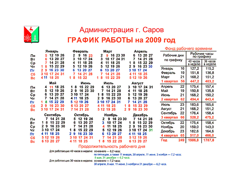 В установленном графике работы администрации на 2009 год выходными объявлены 1-10 января, 23 февраля и 9 марта, 1 и 11 мая, 12 июня и 4 ноября.
